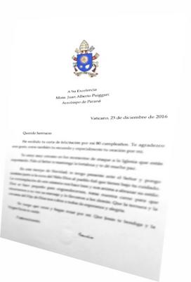 El Papa Francisco saludo a Monseñor Juan Alberto Puiggari, a través de una misiva en la que le expresó además su cercanía con la Arquidiócesis. En otro tramo de la carta, fechada en diciembre, el Papa agradece las salutaciones enviadas por el cumpleaños número 80, la oración y el recuerdo fraterno. |